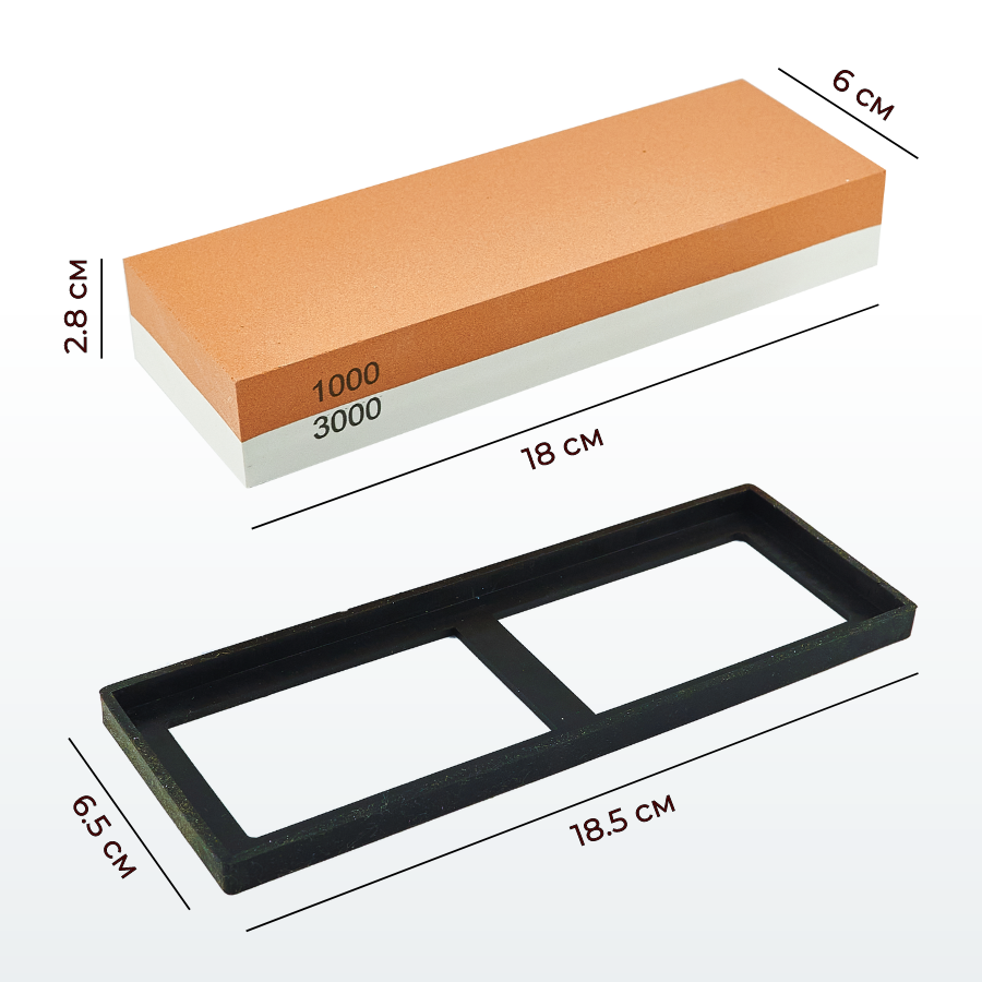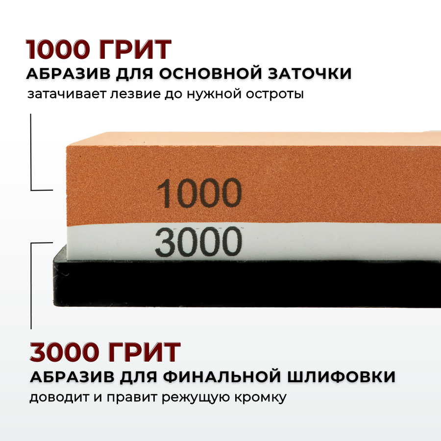 Точило для ножей имеет две рабочие поверхности с разным коэффициентом зернистости: 1000 грит для предварительной заточки (удаляет микродефекты, выравнивает кромку лезвия, доводит до нужной остроты), 3000 грит для финальной шлифовки (доводит и правит режущую кромку).