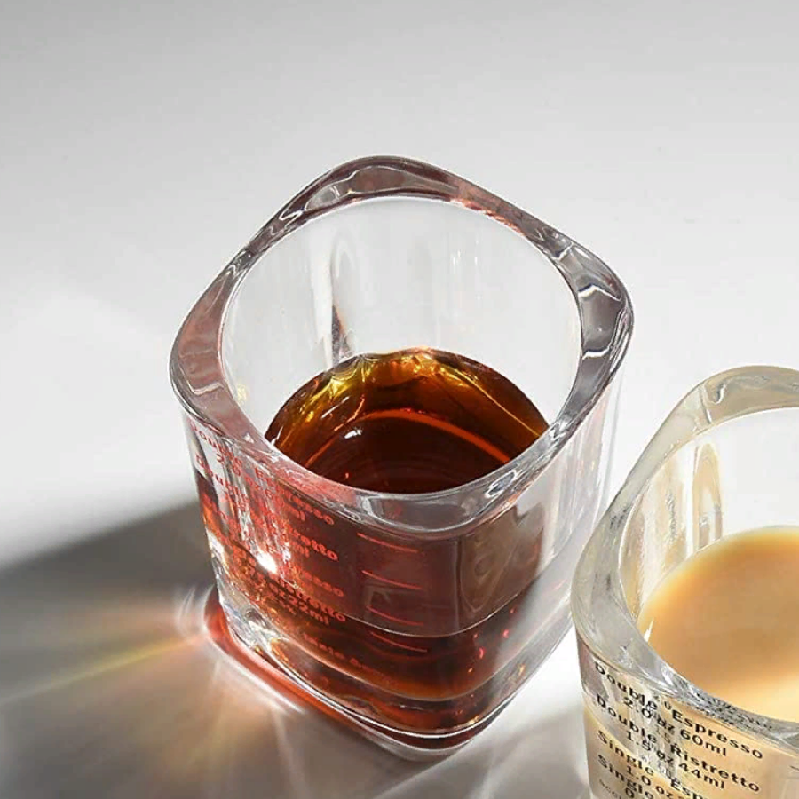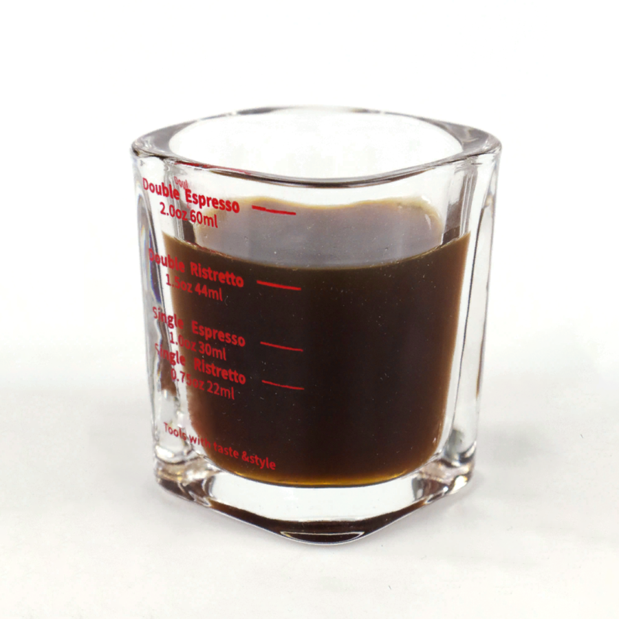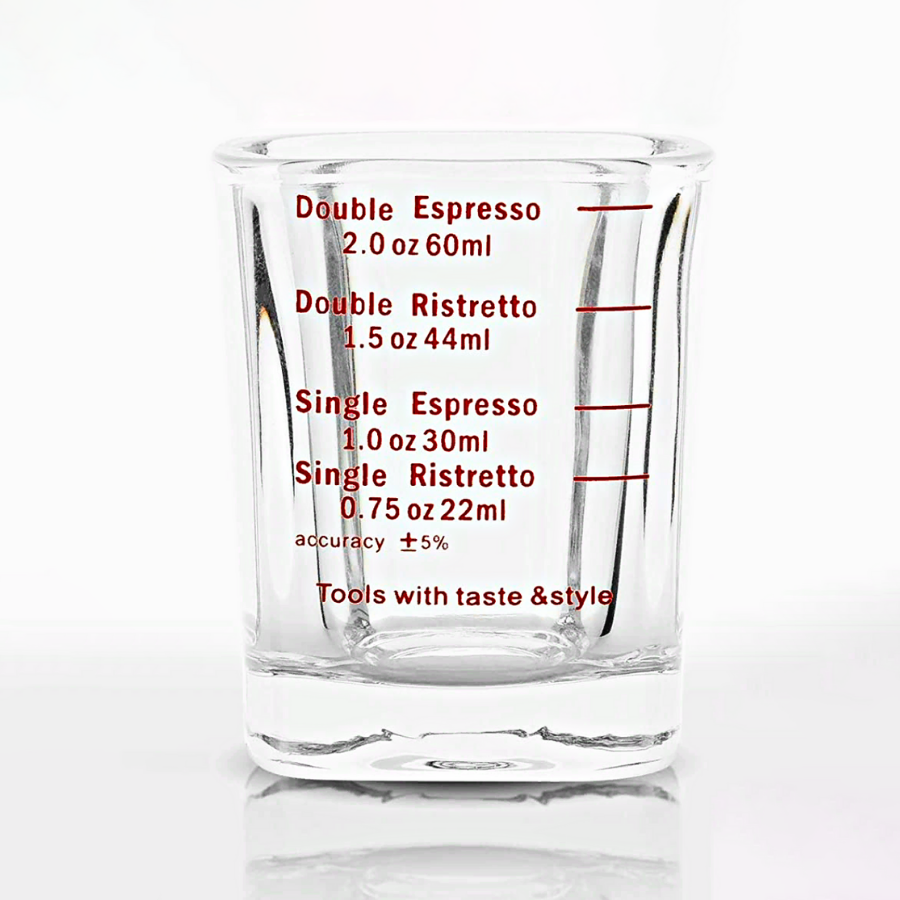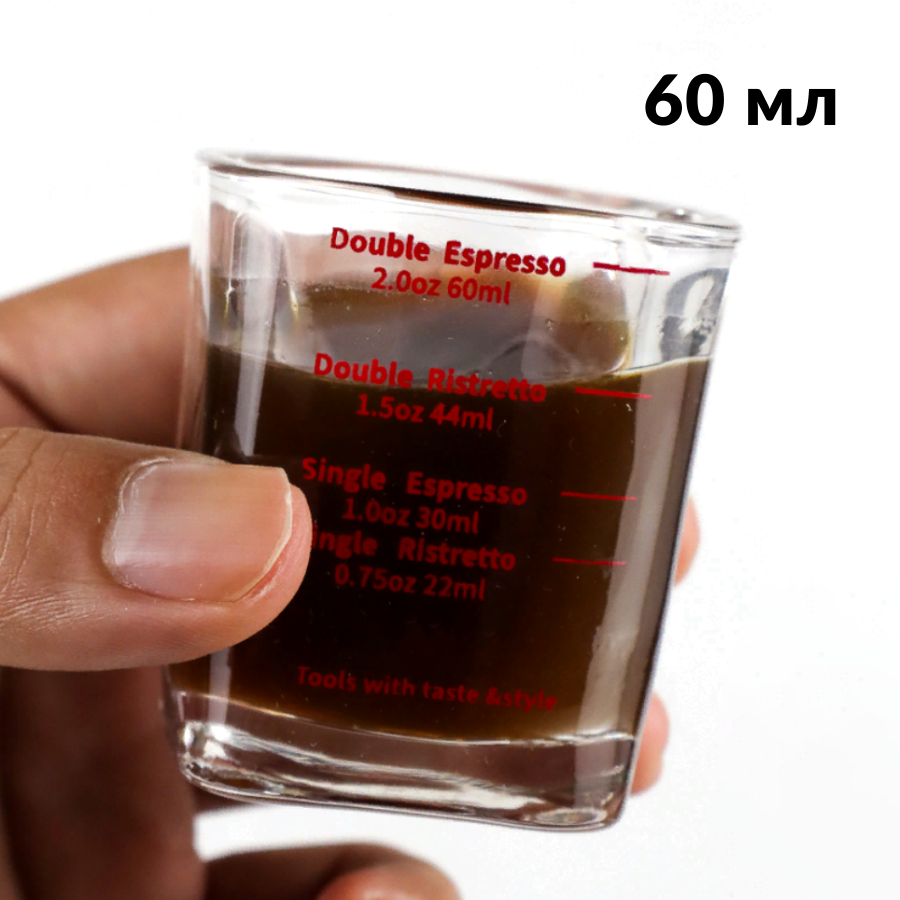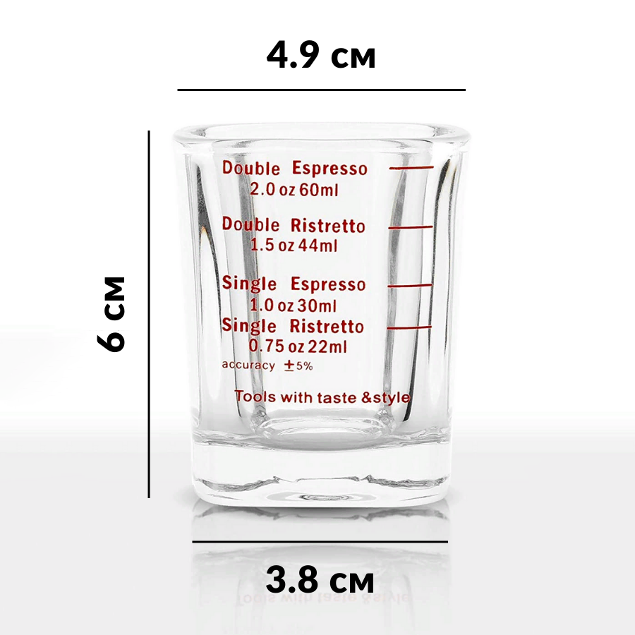 Мерник для эспрессо (мерный стакан из стекла) имеет общий объем 60 мл. Эспрессо шот имеет четкие мерные шкалы в миллилитрах, рядом указано в унциях. Красные линии измерения не стираются даже после долговременного использования. Рюмка мерная (рюмка для эспрессо) имеет следующие мерные шкалы: двойное эспрессо – 60 мл, двойное ристретто – 44 мл, одиночная порция эспрессо – 30 мл, одиночная порция ристретто – 22 мл.