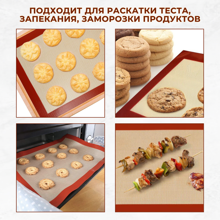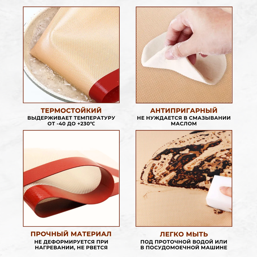 АНТИПРИГАРНЫЙ коврик для выпечки многоразовый не требует предварительного смазывания поверхности маслом, предотвращает прилипание теста и продуктов и не даёт продукту пригореть.