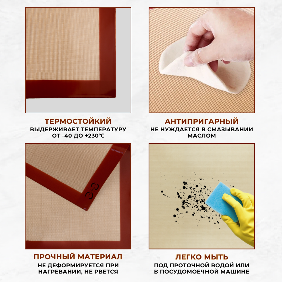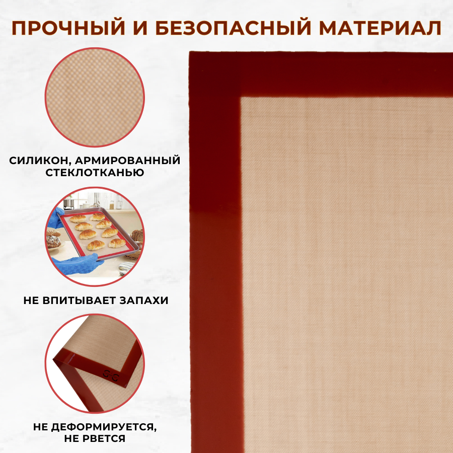 ДОЛГОВЕЧНЫЙ И БЕЗОПАСНЫЙ: коврик для выпечки силиконовый 600х400 мм выполнен из высококачественного пищевого силикона, армированный стеклотканью, который обладает прочностью и долговечностью. Тефлоновый коврик для выпечки многоразовый не впитывает запахи и не вступает в реакцию с продуктами питания, что делает его безопасным для здоровья.