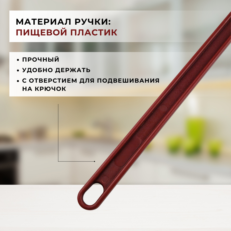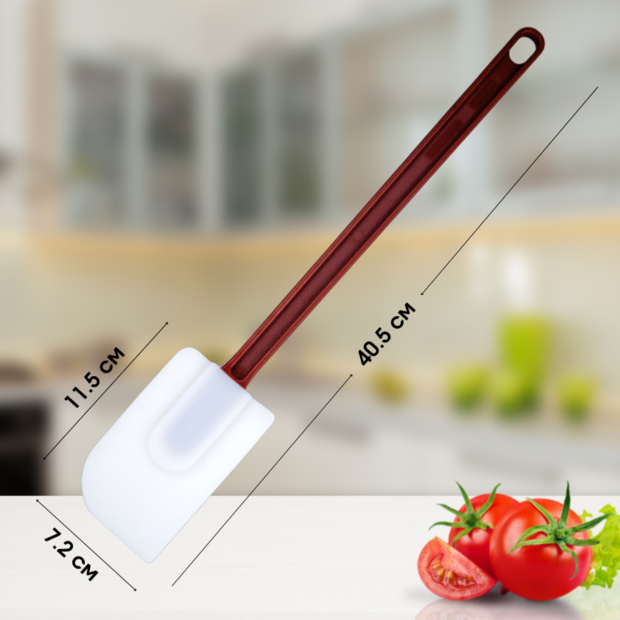 У лопатки для кухни (лопатка для теста, лопатка для торта) очень удобная длинная ручка из прочного пищевого пластика. Специальный упор на ручке лопатки кулинарной позволяет положить прибор прямо на стол, не допуская соприкосновения с поверхностью. Кухонную лопатку силиконовую можно подвешивать, на ручке имеется специальное отверстие.