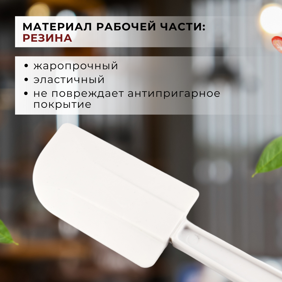 Рабочая часть кухонной лопатки изготовлена из высококачественной жаропрочной резины, поэтому лопатка кулинарная не боится ни холодных, ни горячих температур до 110°С. Кроме этого, кондитерская лопатка пластиковая не царапает поверхность, поэтому кондитерская лопатка идеальна для приготовления еды на посуде с антипригарным покрытием. Гибкая, но с твердым основанием, лопатка кухонная пластиковая позволит очистить миски от жидкого теста и крема, что достаточно трудно сделать обычной ложкой или деревянной лопаткой. Резиновая лопатка для сковороды имеет эластичную лопасть, чтобы аккуратно собирать продукт со стенок посуды (в том числе, с деликатным покрытием).