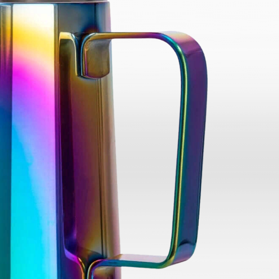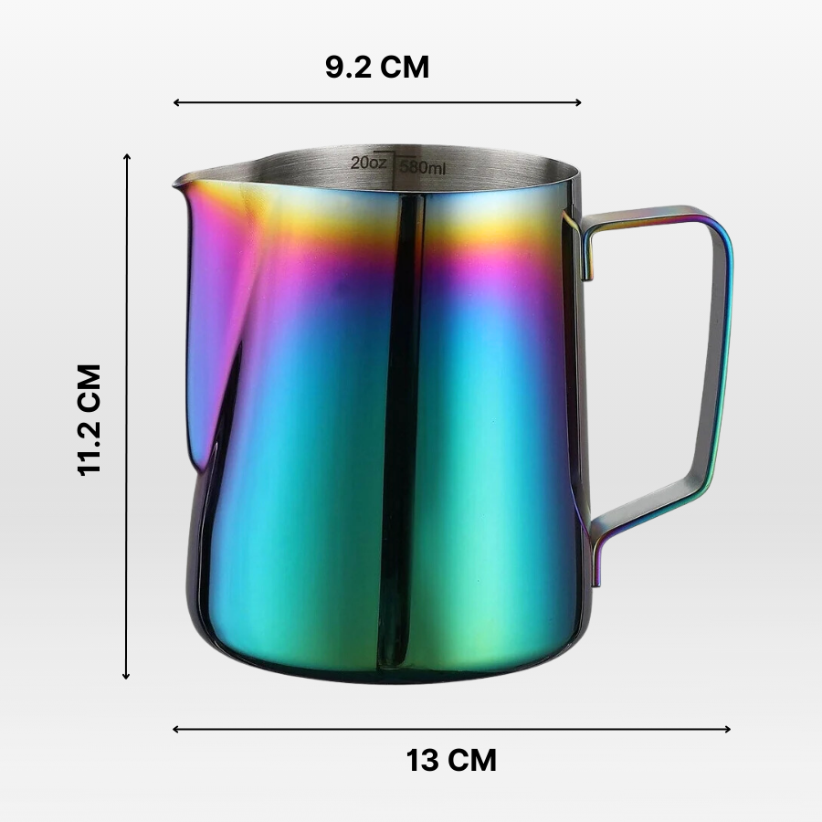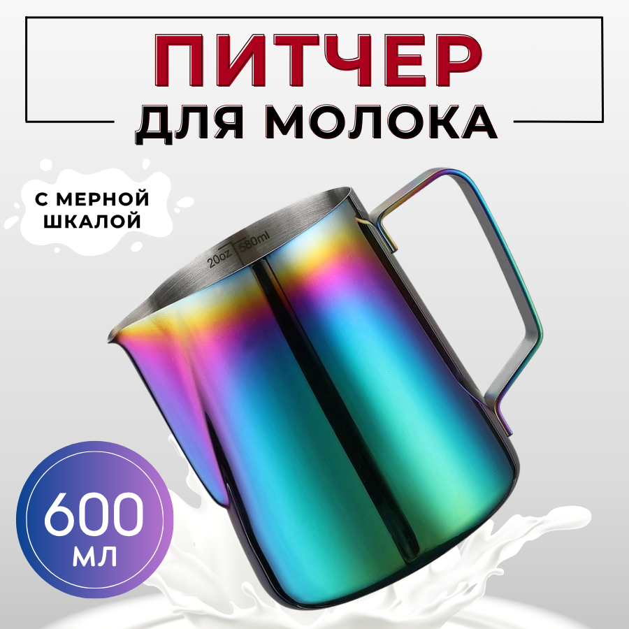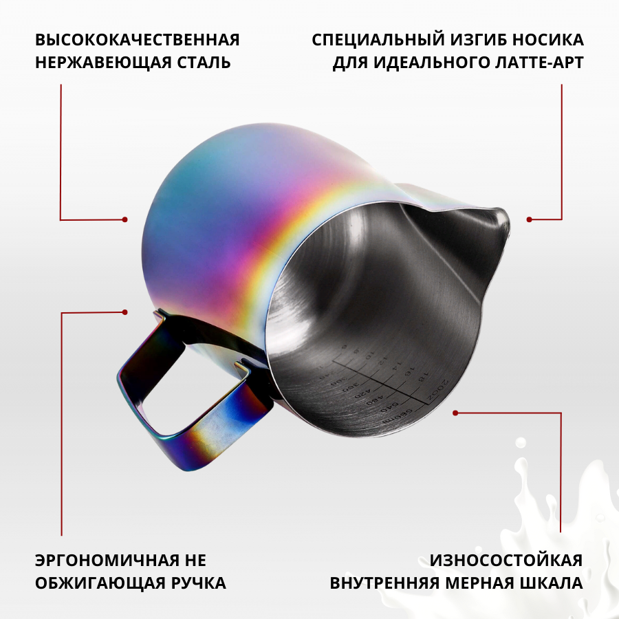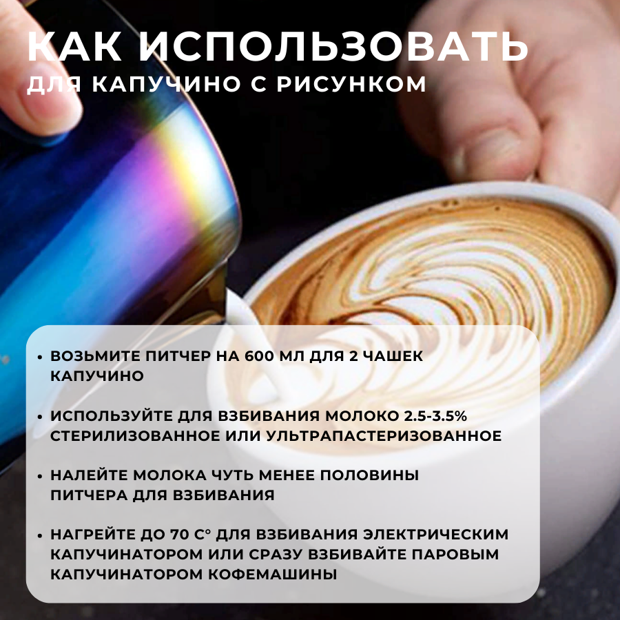 Специальная конструкция носика предотвращает утечку молока, а также позволяет создавать различные узоры на воздушной молочной пенке. Благодаря удобной ручке использование питчера металлического становится максимально комфортным. Молочник для капучино используется для взбивания молока с помощью стимеров или капучинаторов. Идеален как молочник для латте-арта.