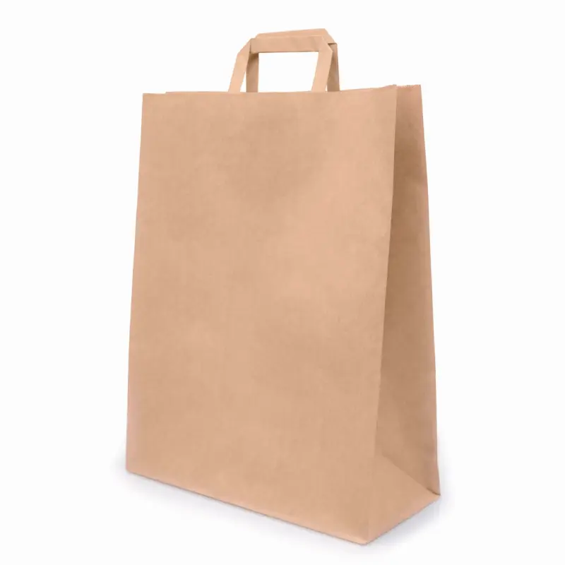 KPP035 — бумажный пакет с плоскими ручками и прямоугольным дном, изготовлен из крафтовой бумаги. Высота — 450 мм. Ширина — 350 мм. Глубина — 150 мм. Плотность бумаги — 70 г/м2. Имеет матовую поверхность и рифленые края. Выдерживает вес до 5 кг. Ручки плотно крепятся к пакету и не рвутся при переноске. Отлично подойдет для доставки любых блюд, продуктов и товаров.
