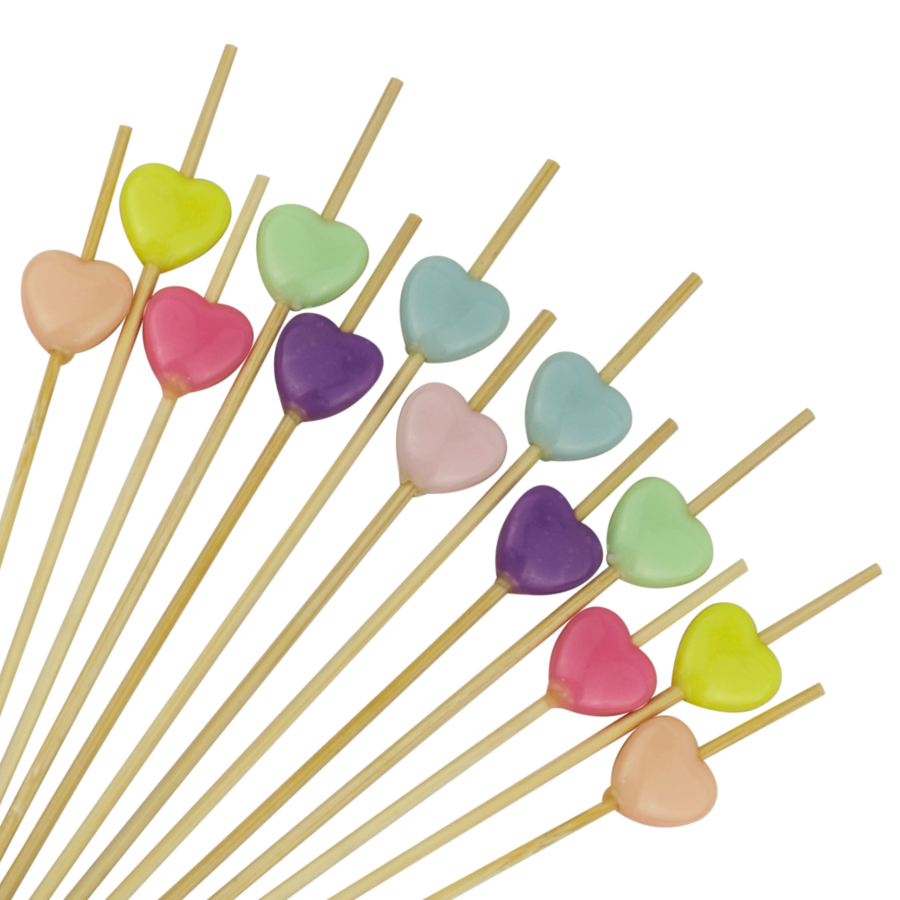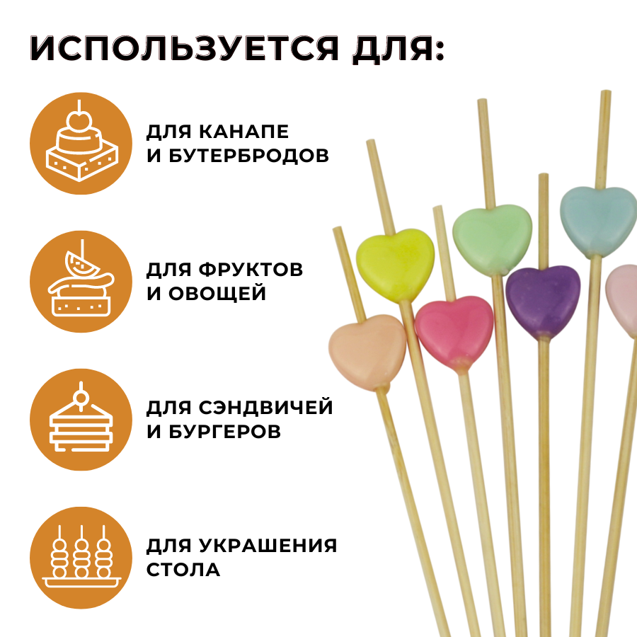 Пика «Сердце» (пика «Сердечко», пика «Разноцветные сердца») в длину составляет 12 см. Продаются упаковкой, в которой 100 штук шпажек. Шпажки деревянные одноразового использования, срок годности не ограничен.