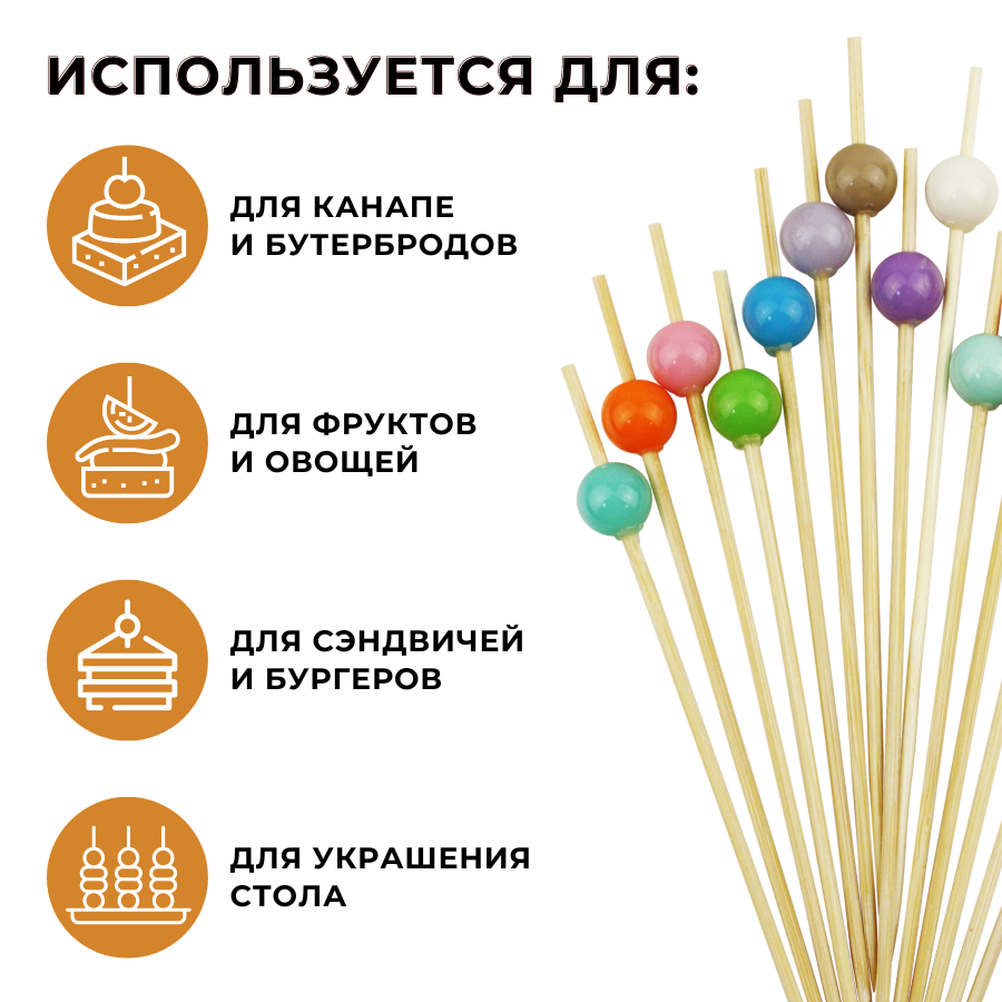 Декоративные пики изготовлены из высококачественных экологически чистых материалов, поэтому безопасны для здоровья человека. Одноразовые деревянные палочки не впитывают влагу, прочные. Палочки для канапе деревянные имеют на конце элемент в виде разноцветных шариков. Кончики хорошо заострены и легко нанизывают ингредиенты, не повреждая их.