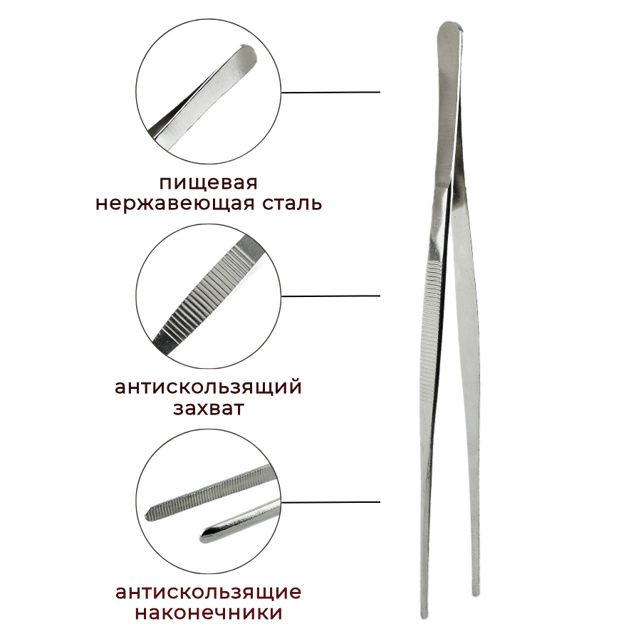 Щипцы кухонные или пинцет кулинарный - это незаменимый и многофункциональный инвентарь в доме. Длинный универсальный пинцет отлично справится со множеством задач на вашей кухне. Кулинарные щипцы отлично подходят для работы с горячими блюдами, применяется при сервировке стола, для украшения десертов, салатов. Пинцет будет полезен при приготовлении мяса, стейка; он используется для барбекю, для удаления костей из рыбы. С помощью такого аксессуара вы гарантированно получите хрустящую корочку с каждой стороны жарящегося продукта.
