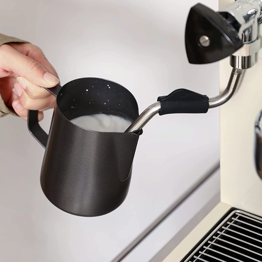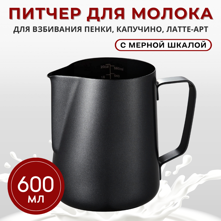 Питчер для взбивания молока изготовлен из нержавеющей стали, благодаря чему не только обладает высокой надёжностью и долговечностью, но и помогает лучше контролировать процесс вспенивания молока, благодаря хорошей теплопроводности металла. Поверх стали нанесено тефлоновое покрытие, что обеспечивает легкую очистку от пригоревших капель молока во время работы с паровой трубкой. Благодаря антипригарному покрытию в черном цвете, питчер 600 мл выглядит эффектно и стильно.