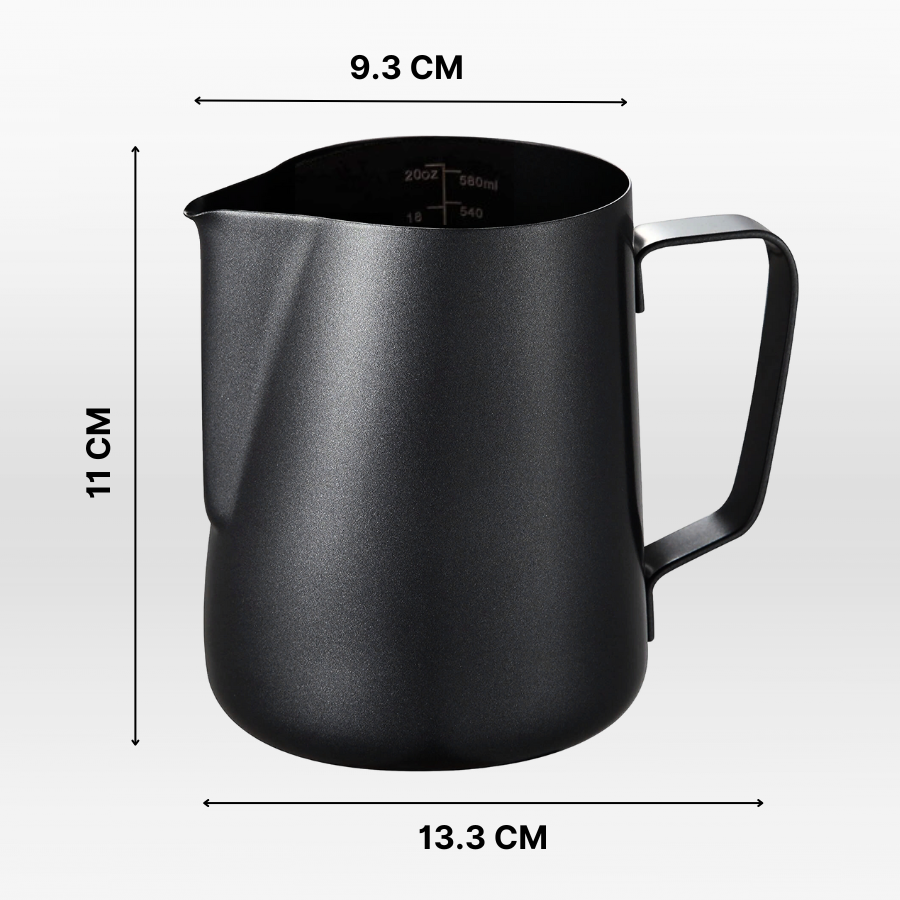 Питчер для молока с мерной шкалой. Нестираемая разметка внутри питчера для точной порции молока. Деления в миллилитрах и в унциях. Объем кувшина для вспенивания молока - 600 мл. Высота: 11 см. Диаметр по верху: 9.3 см. Длина от края носика до конца ручки: 13.3 см.