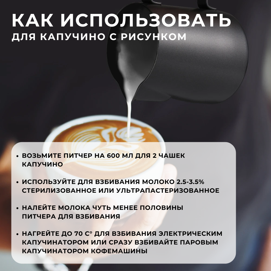 Специальная конструкция носика предотвращает утечку молока, а также позволяет создавать различные узоры на воздушной молочной пенке. Благодаря удобной ручке использование питчера для капучино становится максимально комфортным. Молочник для капучино используется для взбивания молока с помощью стимеров или капучинаторов. В питчере для кофе удобно нагревать, взбивать и хранить молоко. Молочник питчер идеален как молочник для латте-арта.