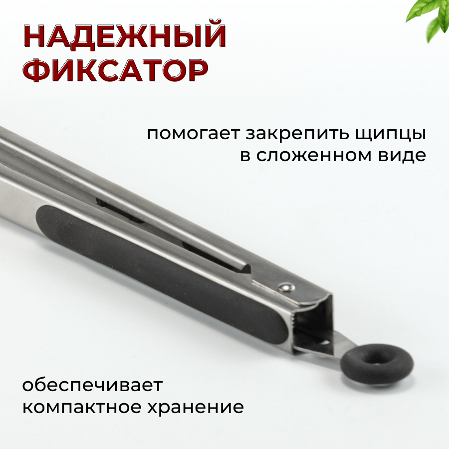 Щипцы кухонные для жарки выполнены из коррозионностойкой нержавеющей стали, которая не впитывает неприятные запахи, не нагревается, не скользит и легко моется. Щипцы для гриля и мангала имеют силиконовые вставки на ручках, которые не позволят щипцам выскользнуть из вашей руки и защитят от ожогов во время использования. Щипцы металлические кухонные имеют фиксатор, который блокирует или приводит в действие инструмент. Фиксатор помогает закрепить щипцы для барбекю и гриля в сложенном виде, что обеспечивает компактное и удобное хранение щипцов. Щипцы для стейка имеют лопасти в форме «ракушки», что обеспечивает прочный и удобный захват продукта. Кухонные щипцы для жарки удобно сидят в любой руке.