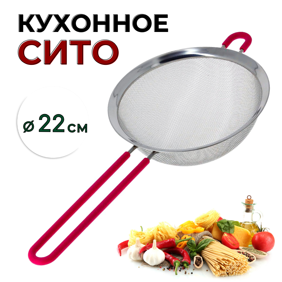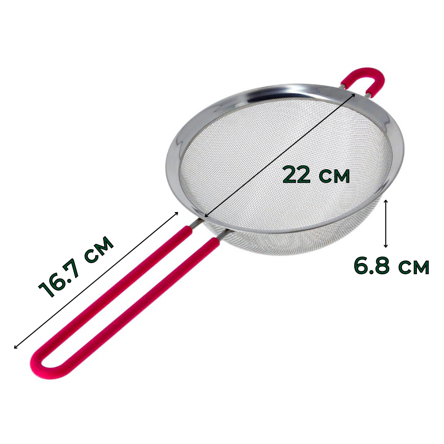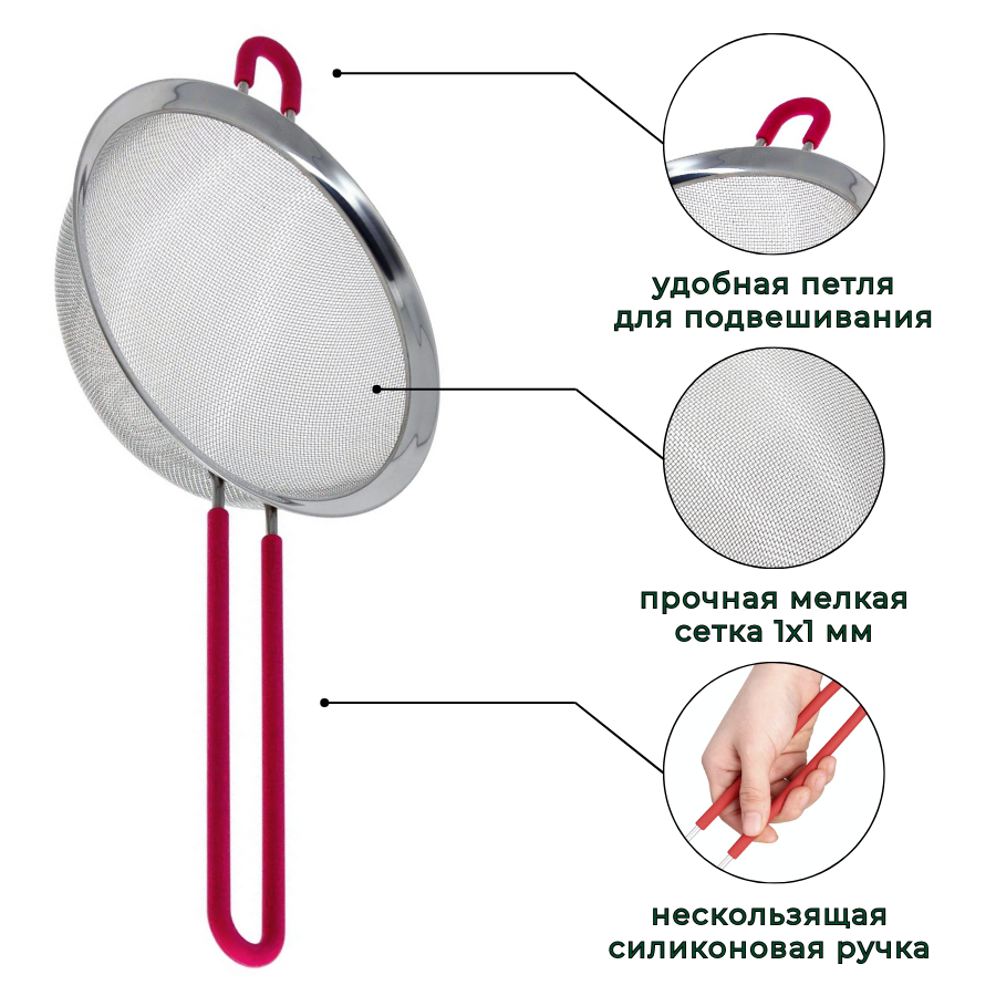 Сито кухонное выполнено из нержавеющей стали, отличается прочностью и долговечностью, не подвергается коррозии и отвечает всем гигиеническим нормам и требованиям. Ручка и петля сита покрыты силиконом – современным и комфортным материалом, который приятен на ощупь и не позволяет ситу выскальзывать из руки или соскальзывать с края ковша/кастрюли во время использования.