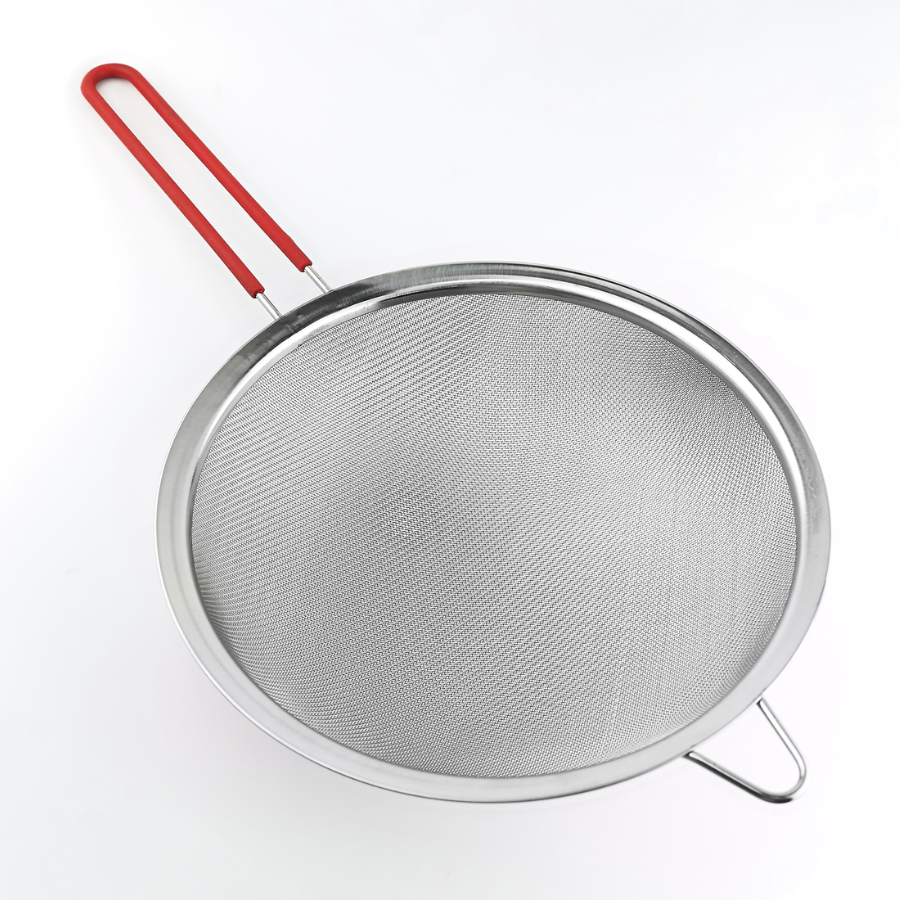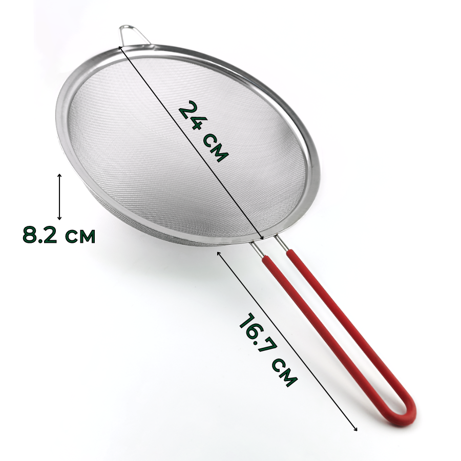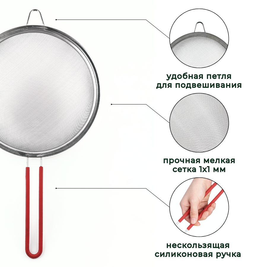 Сито выполнено из нержавеющей стали, отличается прочностью и долговечностью, не подвергается коррозии и отвечает всем гигиеническим нормам и требованиям. Ручка сита покрыта силиконом – современным и комфортным материалом, который приятен на ощупь и не позволяет ситу выскальзывать из руки во время использования.