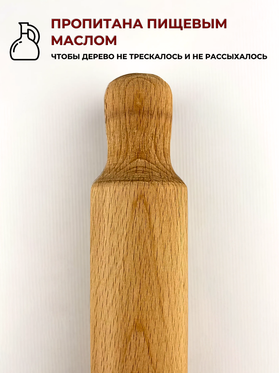 Скалка деревянная длинная изготовлена из бука, благодаря чему она отличается высокой прочностью и долговечностью. Скалка кондитерская пропитана пищевым маслом, что повышает водоотталкивающие и антимикробные свойства инвентаря, защищает деревянную скалку от деформации и растрескивания.