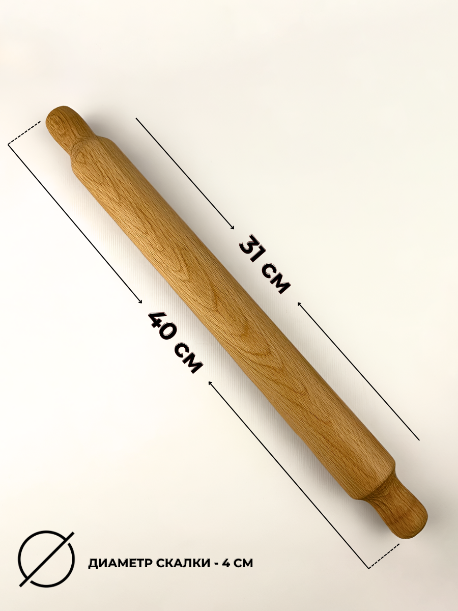 Скалка с ручками имеет следующие размеры: длина общая с ручками – 40 см, длина рабочей части – 31 см, диаметр – 4 см.