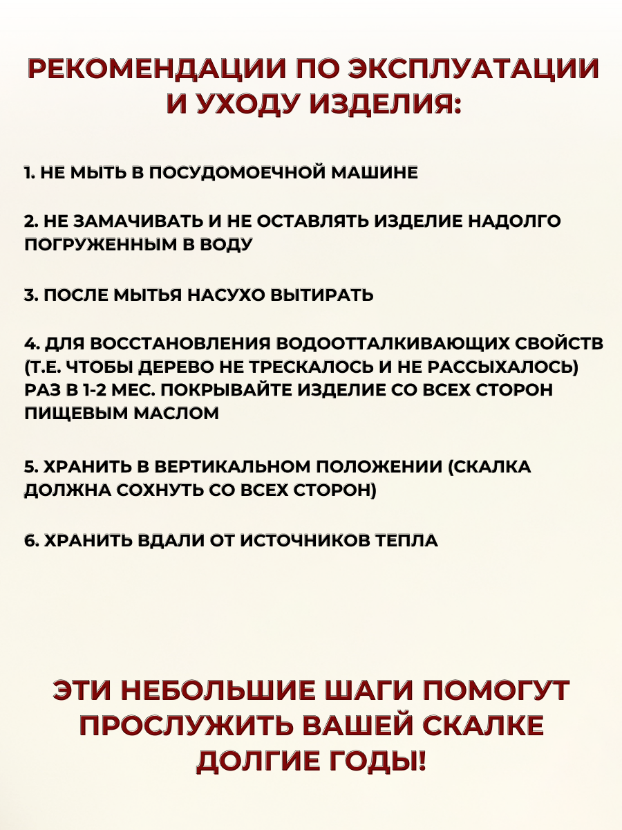 ВНИМАНИЕ!! Периодически обрабатывать любым растительным маслом. Не мыть в посудомоечной машине. После использования протирать сухой тряпочкой. Тестораскатка ручная прослужит Вам долгие годы при соблюдении прилагаемой инструкции по уходу.
