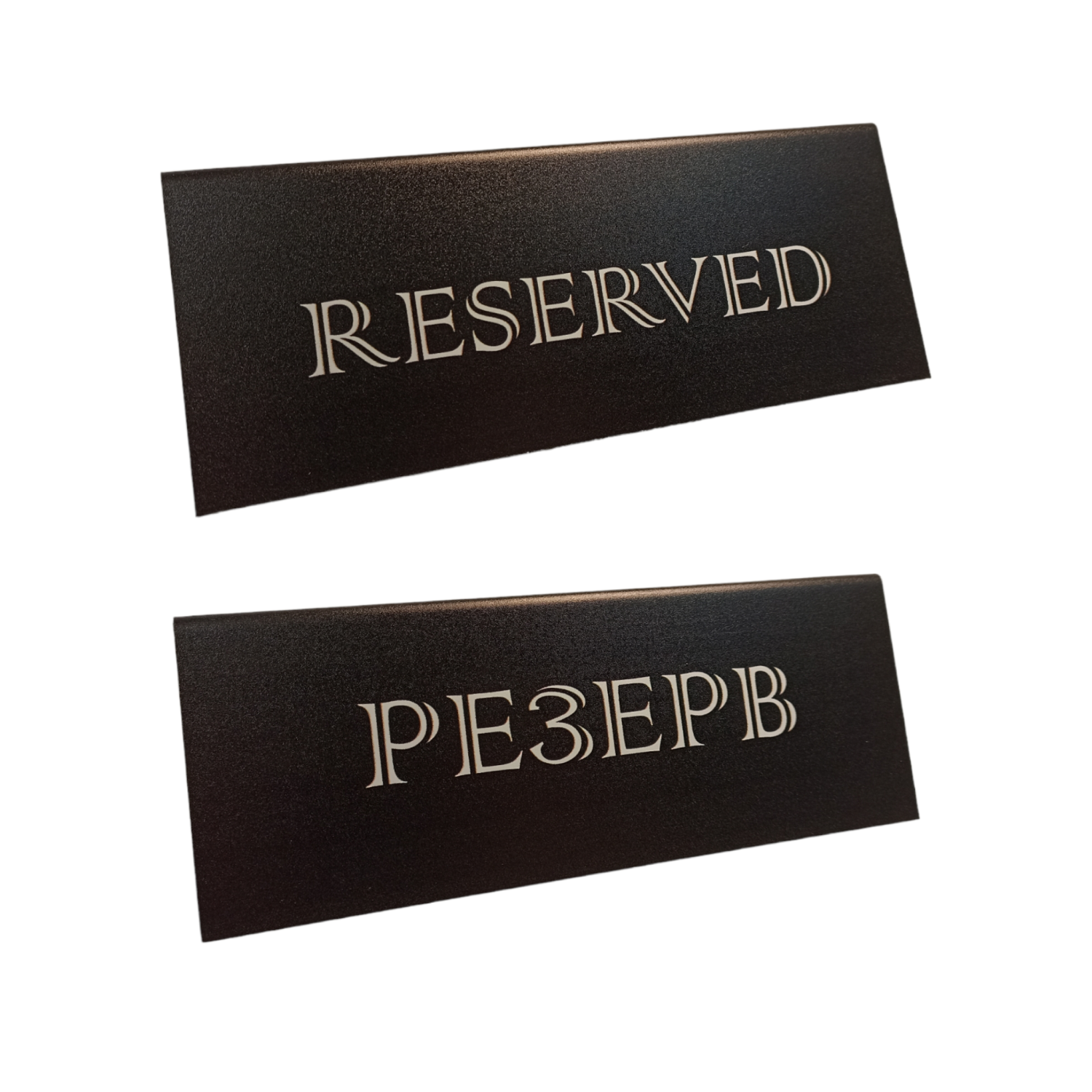 Табличка Резерв черная двусторонняя с английским эквивалентом русского слова. Размер двусторонней таблички 210х80 мм. Универсальна в применении для заведений общепита. Безопасная, ударопрочная табличка которая прослужит долго.